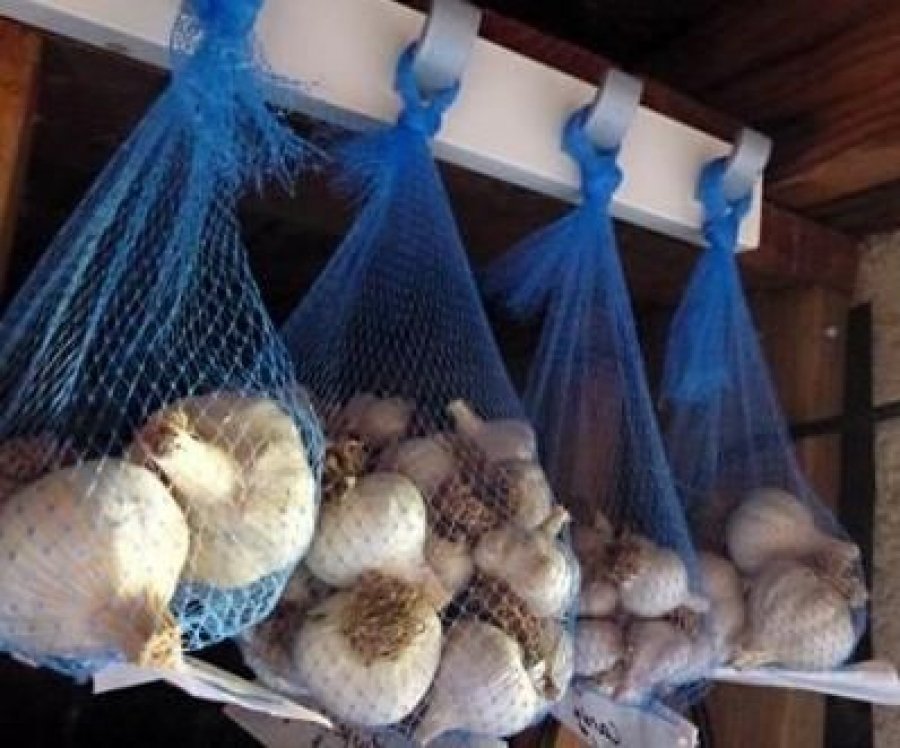 · В качестве тары для хранения используют мешочки из натуральных тканей. Предварительно его нужно замочить в крутом соленом растворе и высушить. Чеснок в таких мешочках не завязывается, остается в открытом виде в прохладном месте и вдали от попадания солнечных лучей.