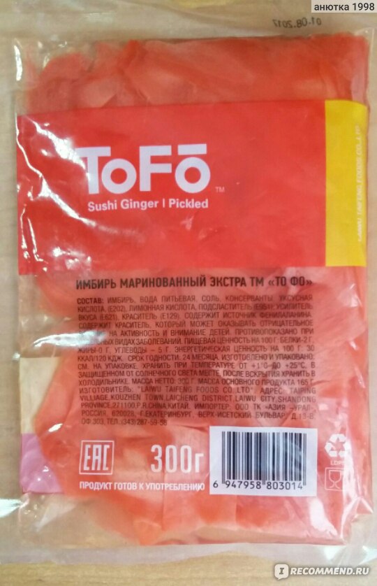 | Фирменный маринованный имбирь | Прочтите инструкции или попросите совета. Некоторые фирменные маринованные имбири требуют немедленного употребления или хранения при комнатной температуре. |