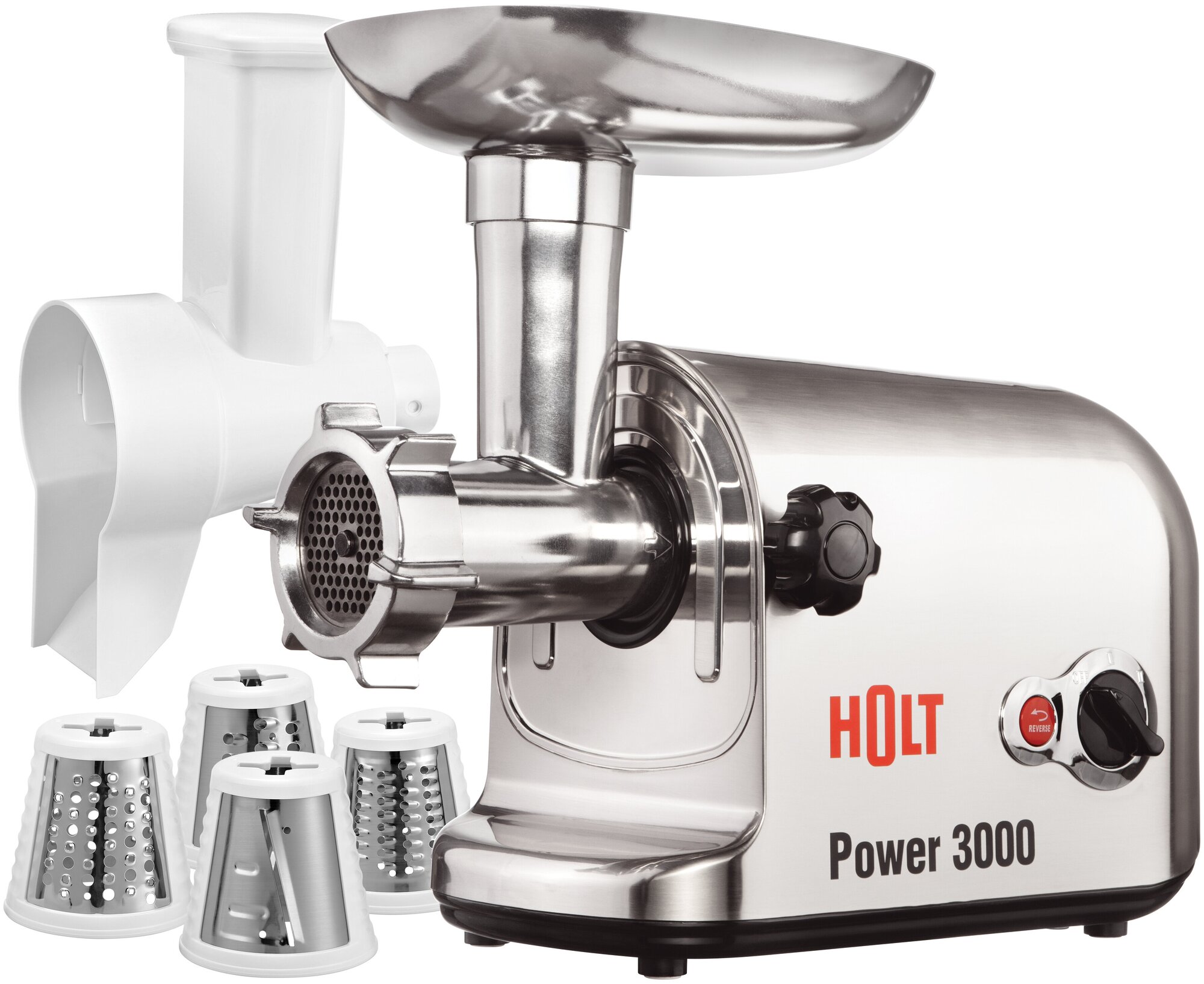 По сути, производительности хватит, чтобы справиться с любой заданной задачей. В конструкцию входит качественный стальной нож, способный обеспечить правильную рубку и измельчение продуктов питания, не повреждая их структуру. Многие пользователи успели оценить качество реализации 2 решеток для приготовления фарша с перфорацией в 5 и 7 миллиметров. Реализована функция «обратный ход» благодаря реверсу, а также возможность без особых усилий очищать конструкцию от ненужных продуктов. Есть механический фиксатор. Устойчивость на поверхности гарантируют прорезиненные ножки.