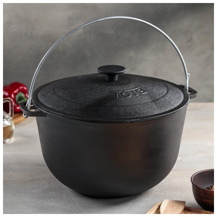 Сверху он имеет самый широкий диаметр всё более сужаясь книзу. Когда посуду опускают непосредственно в очаг, то нагревается пламенем не только само днище, но и округлые боковины.
