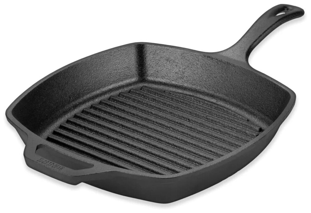 - 12-дюймовая чугунная сковорода-гриль Lodge с двойной ручкой предотвращает попадание жира на блюдо и способствует здоровому приготовлению пищи.