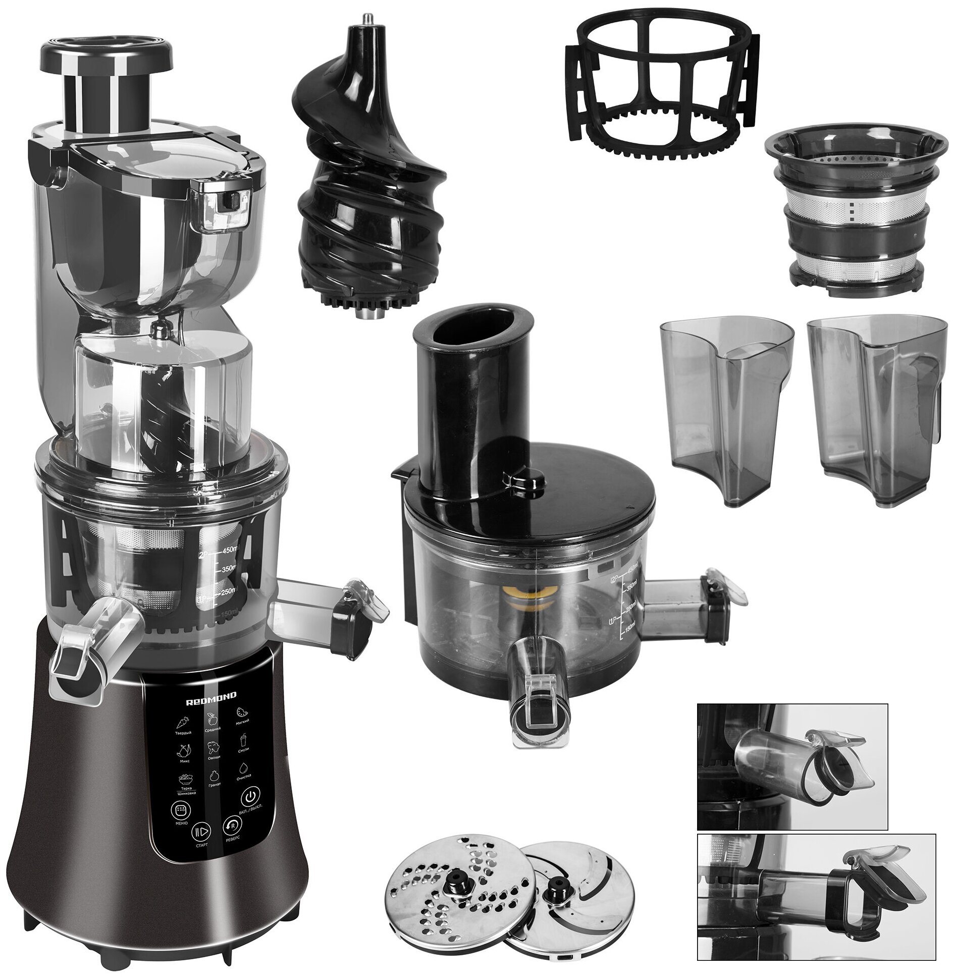 Шнековый вал работает в медленно режиме, а значить двигатель не перегружается и все элементы конструкции не изнашиваются. - Насадки (идущие в комплекте) дают возможность получать из овощей и фруктов не только сок, но и коктейли, соусы, пюре.