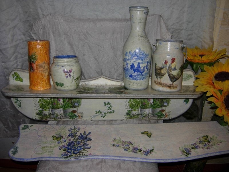 Кухонный декупаж баночек, бутылочек для специй, салфетниц, вешалок для полотенец сделает Вашу комнату для приема еды красивой кулинарной кузницей, где Вы с удовольствием будете готовить обед, собираться с подругами, вести задушевные беседы с домочадцами.