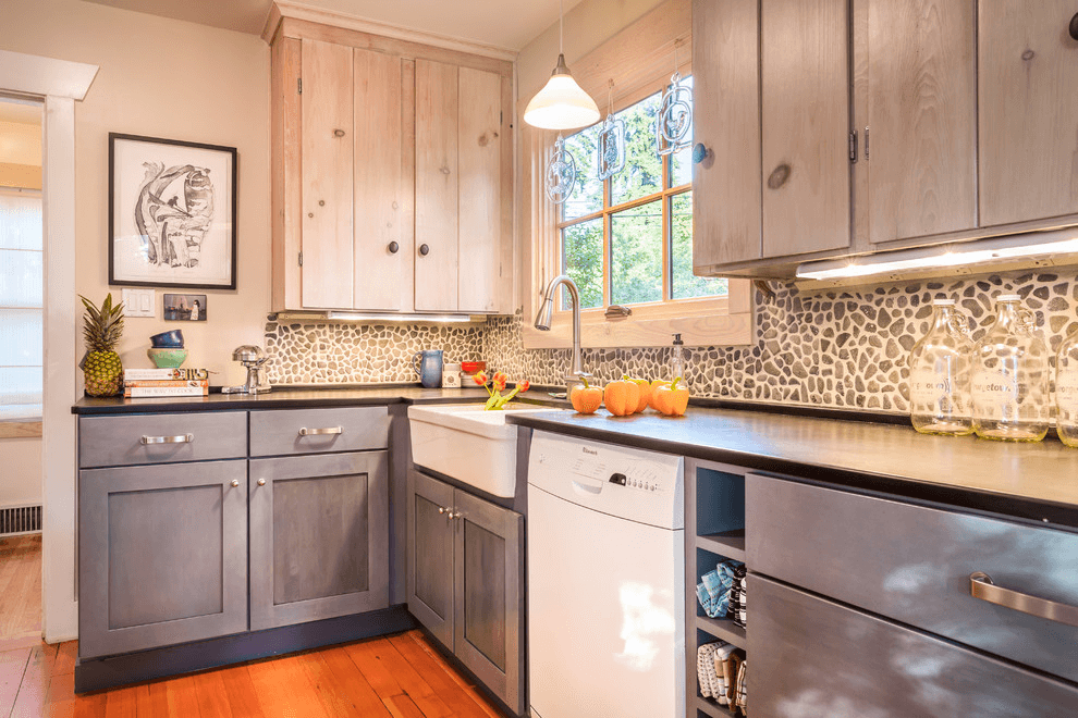 Участок стены между напольными и навесными шкафчиками кухонного гарнитура совсем невелик, но при этом должен быть защищен в большей степени, чем остальные стены. Испарения при готовке, сырость возле мойки, брызги при приготовлении пищи и резки продуктов – все это буквально уничтожает обычную штукатурку, побелку или обои.