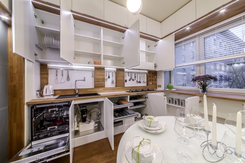 Чтобы облегчить оформление кухни, можно отказаться от установки верхних шкафов на одной из стен, их также можно заменить открытыми полками. В углу будет лучше смотреться трапециевидная тумба, в которой можно разместить мойку или варочную панель. Современные гнутые фасады помогут создать плавные переходы в углах.