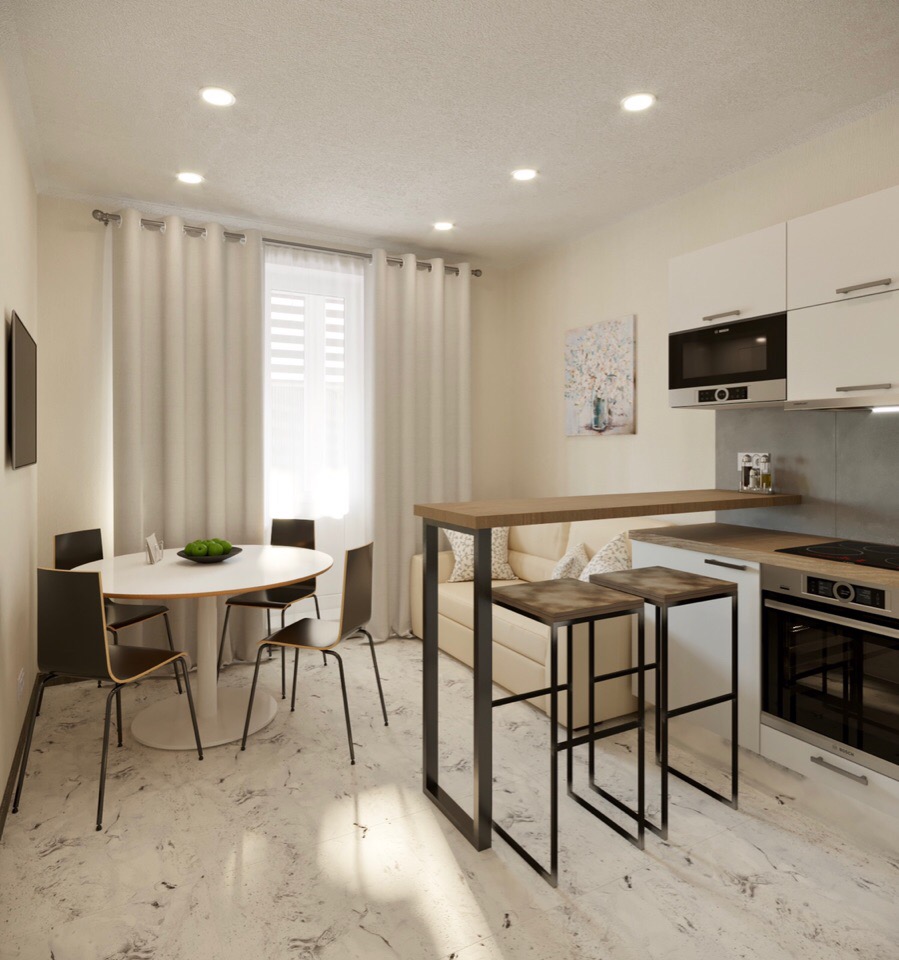Необходимо определить, на какие зоны должны быть разделено помещение. В просторных многокомнатных квартирах кухня и столовая могут находиться в разных изолированных помещениях. Если же речь идет об однокомнатной квартире, то в данном случае часто требуется совмещение кухни, столовой, небольшого рабочего места и даже зоны отдыха.