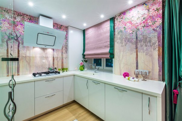 В данном варианте отсутствуют верхние шкафы кухонного гарнитура, вместо них можно повесить большой телевизор.