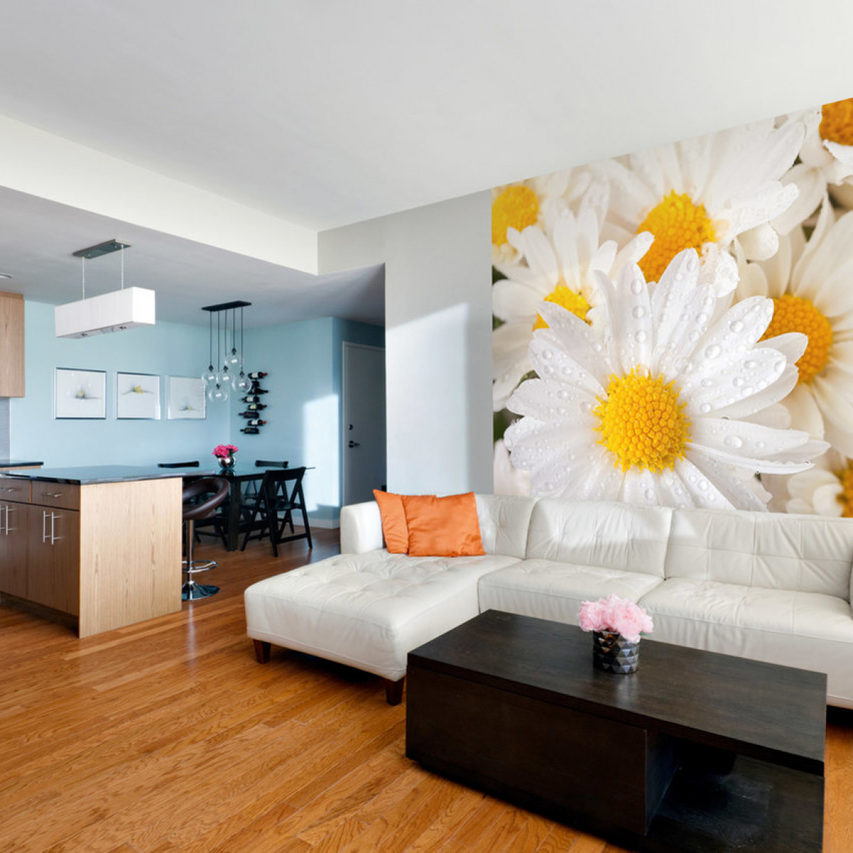 С их помощью можно зонировать комнату и обратить внимание на конкретный участок кухни. Фотообои как-бы обрамляют определенное место кухни, делая его важным. Обычно в таком месте находится обеденный стол, однако в зависимости от планировки помещения, мы можете придумать свое назначение такому закутку.