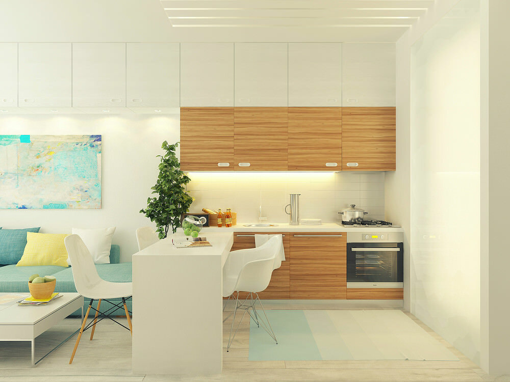 В условиях ограниченного пространства отличным решением станет отказ от громоздкого гарнитура. Выделите для зоны кухни небольшое пространство, оборудовав его самым необходимым. Такой вариант особенно подойдет маленьким семьям и тем, кто из-за плотного рабочего графика не так много времени проводит у плиты.