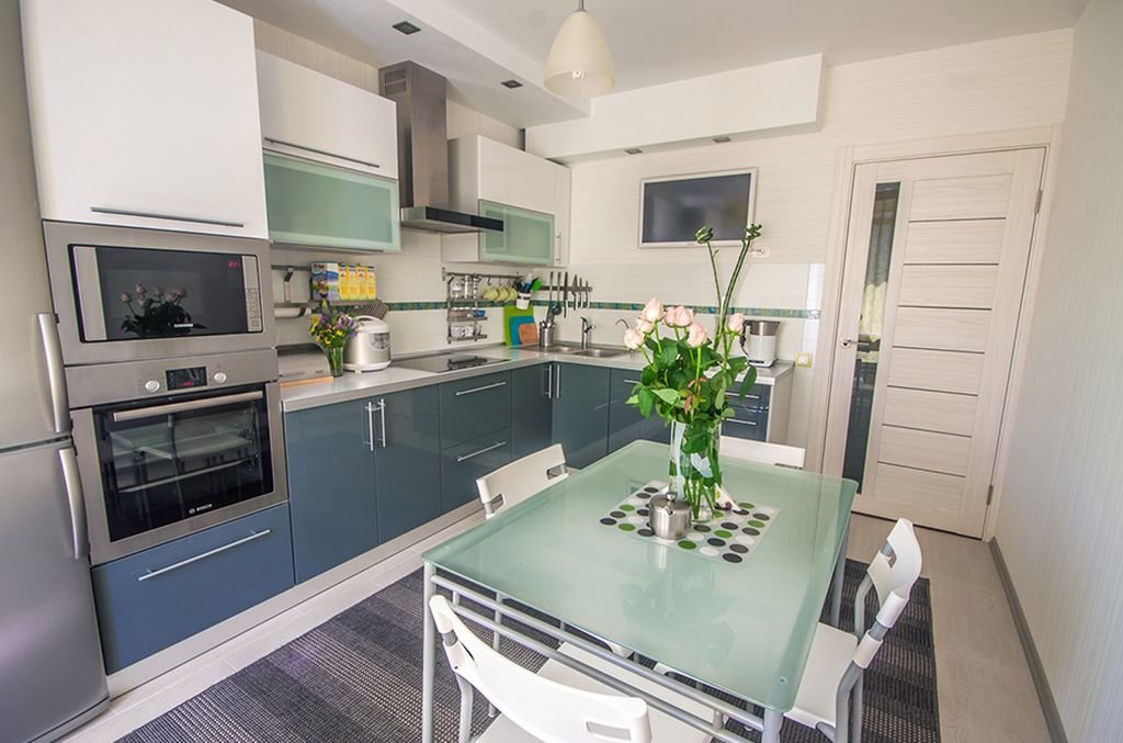 - Маленькая кухня площадью 12 кв. м будет выглядеть очень уютной и стильной, если оформить ее в белых и зеленых тонах, а на пол постелить деревянные панели. В такой обстановке будет гармонично смотреться комплект стола и стульев из дерева. Именно на стене у стола найдется место для маленького телевизора.