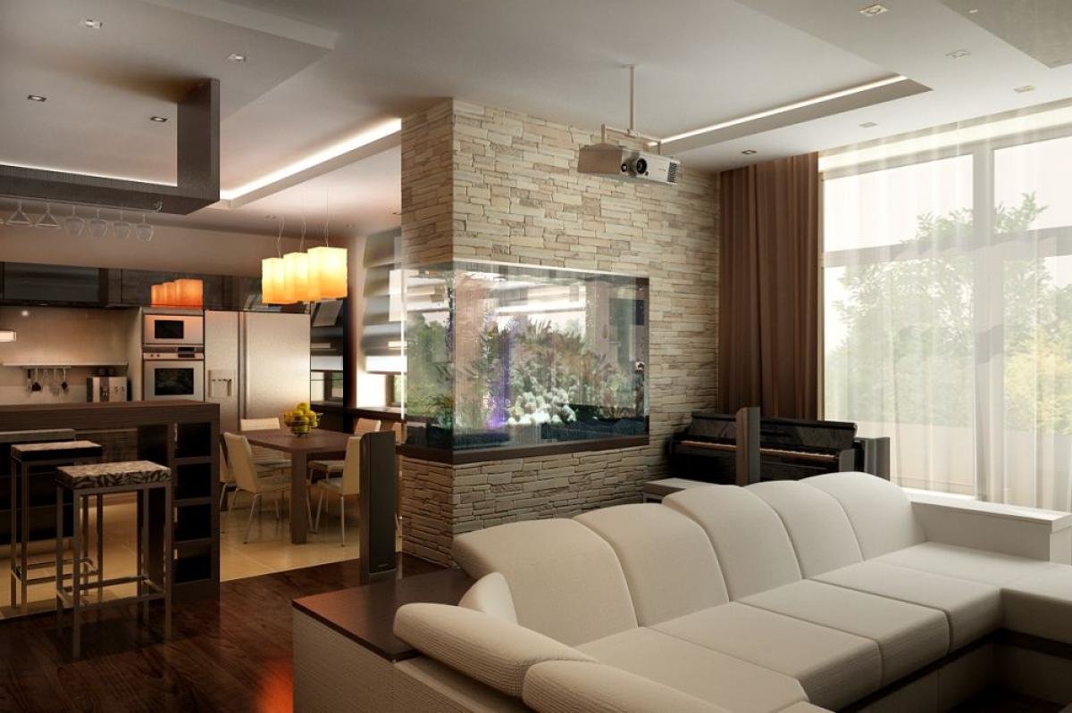 Благодаря такому дизайнерскому решению кухня-гостиная будет смотреться стильно и своевременно. Единственным недостатком такого дизайна будет уменьшение площади свободного пространства.