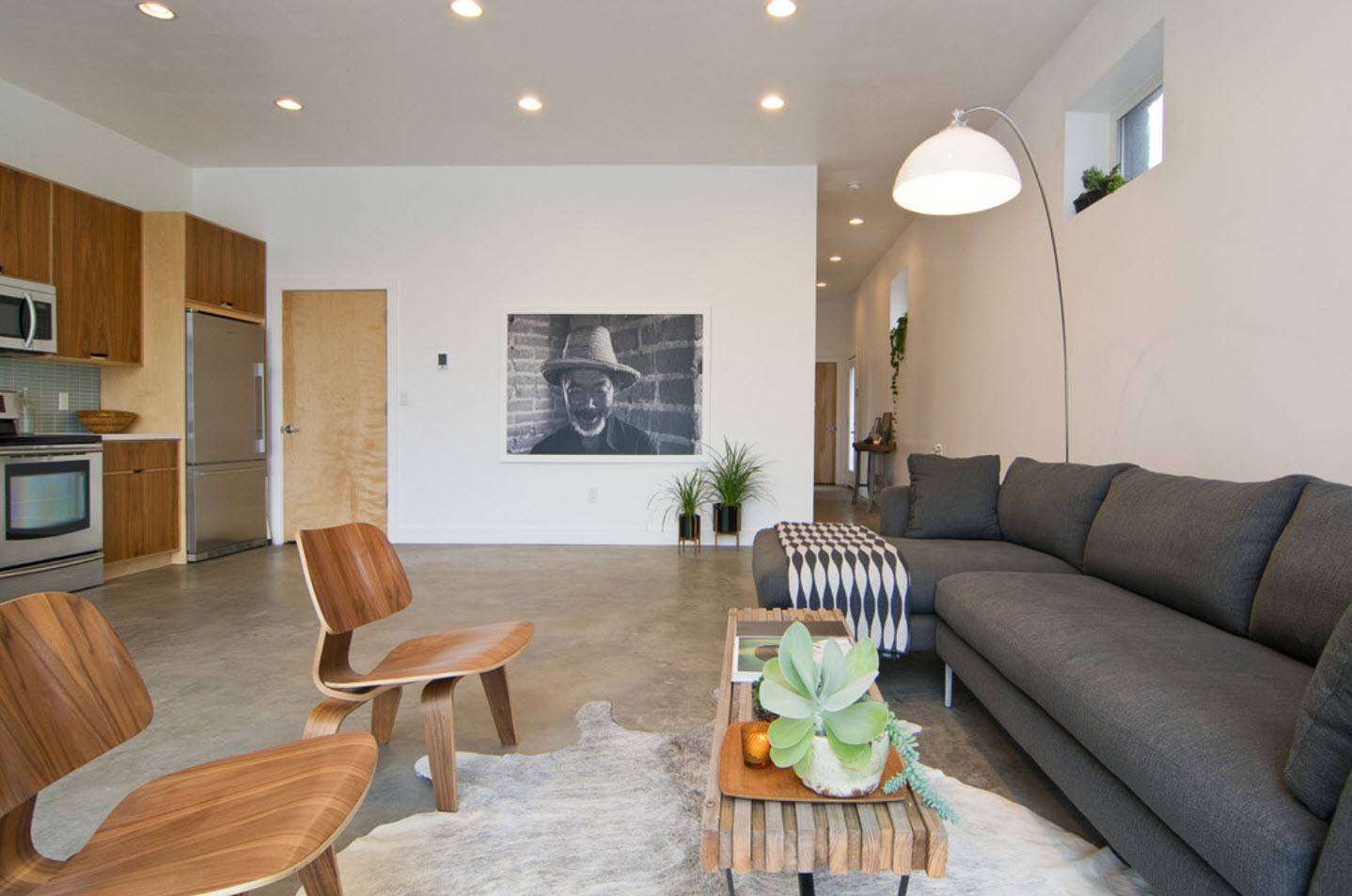 Входная дверь открывается прямо в гостиную. Здесь же расположена кухня. Оба они размещены вдоль одной из стен. Несмотря на меньшую площадь пола, в комнате действительно не чувствуется тесноты. Гостиная небольшая и в основном состоит из минималистской скамейки, продолжающей кухонную стойку.