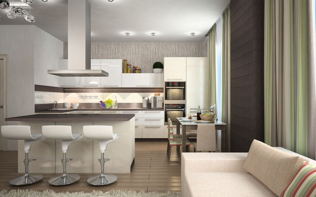 При этом вовсе не нужно на кухне и в зале клеить схожие обои или устанавливать одинаковое напольное покрытие. Такие зоны могут иметь разное декоративное оформление, но при этом они должны идеально сочетаться между собой.