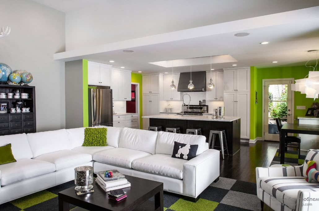 Зонировать кухню с гостиной можно посредством мягкой мебели (фото проектов можно посмотреть ниже). Например, на границе между двумя зонами следует установить диван, на котором хозяева и их гости смогут отдыхать и смотреть любимые фильмы.