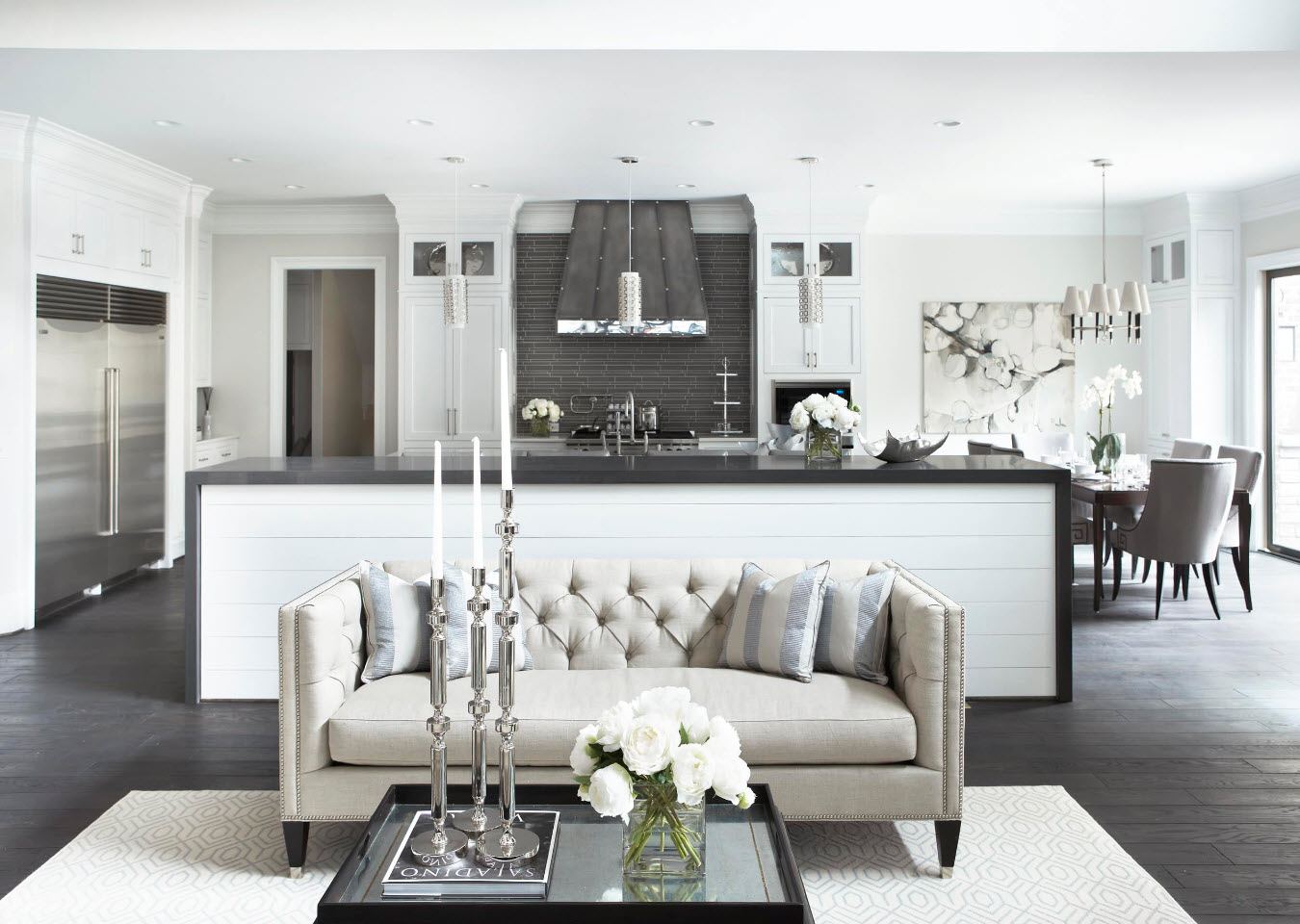 При разработке интерьера в соединенной с кухней гостиной в частном доме или квартире, хозяева должны грамотно подобрать для него мебель. Нужно добавить, что методом диванов, кресел, стенок и других деталей мебели можно делать зонирование. К примеру, высокая стенка может быть в качестве сплошного барьера.