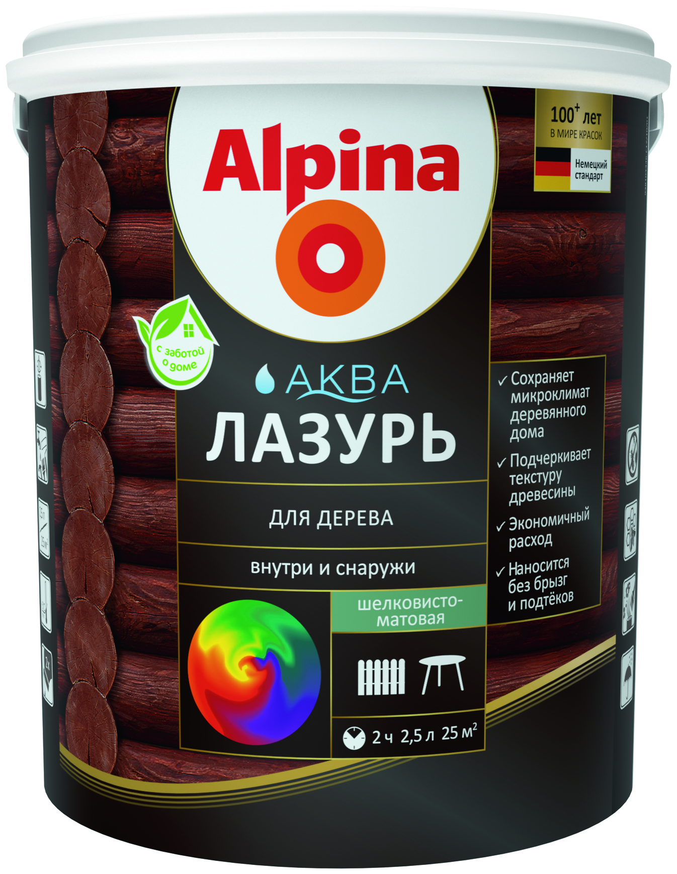 Формирует атмосферостойкое покрытие, защищает дерево от УФ излучения, биоповреждений а так же и влаги. Покрытие регулирует влажность древесины -поверхность «дышит», легко испаряется лишняя влага и одновременно покрытие отталкивает воду.