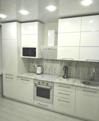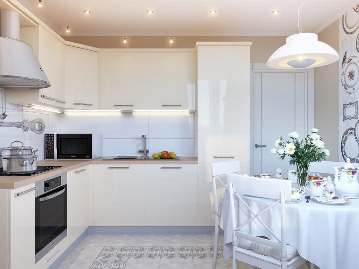 - белый цвет отражает солнечные лучи. Это важно для комнат с неудобной планировкой в которые попадает мало естественного света, а также для кухонь без окон. К примеру размещенных в коридоре. В белом оформляют не только фасады гарнитура, но и натяжной потолок. А благодаря глянцевому блеску они отлично дополнят освещение кухни;