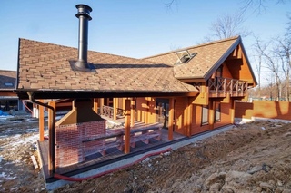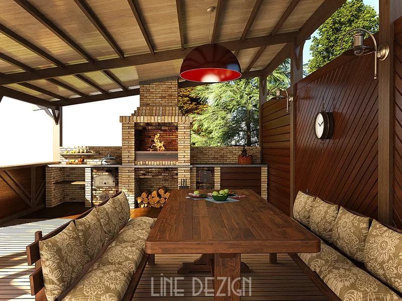 - С мангалом. Пристроенную к дому беседку можно выполнить в виде навеса над печью или мангалом. Для большой компании, которая любит проводить отдых с шашлыками и прочими радостями, это будет притягательным местом.