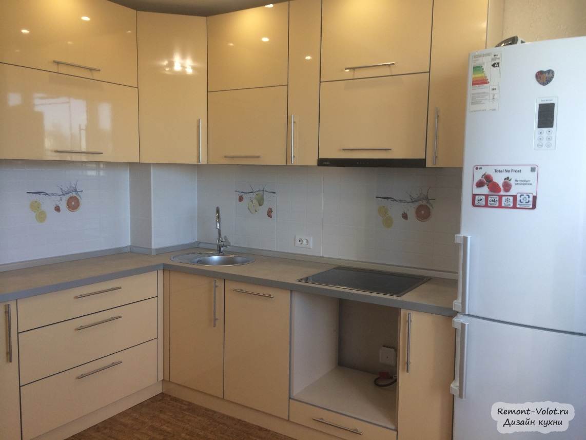 Кухонный гарнитур со светлыми фасадами лучше всего сочетается с бежевым холодильником.