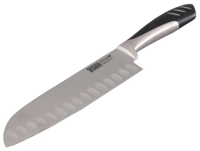 Такая форма позволяет использовать режущую кромку на 100%. Некоторые из моделей имеют по одной стороне лезвия продольные выемки. Они уменьшают прилипание к лезвию продуктов при их разделке. Клинок, легкий и тонкий, имеет одностороннюю заточку, традиционную в Японии. Но, сейчас появились модели Сантоку с двустронней заточкой, которые очень популярны на Западе; - Длина лезвия – от 12 до 20 см.
