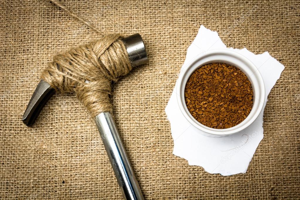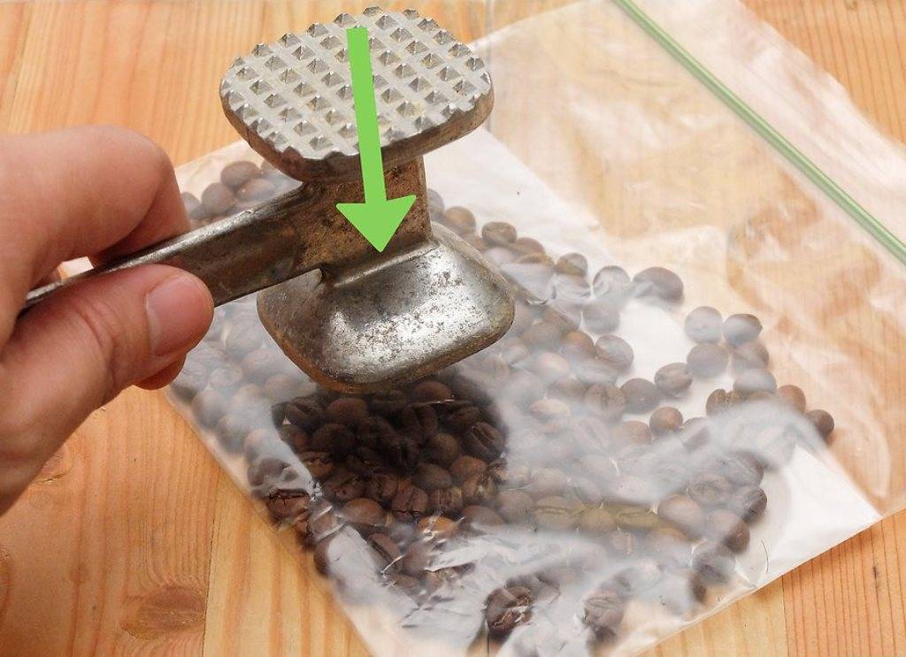 Не вполне очевидный способ помола. Но и не самый плохой. Для измельчения зерен необходимо отмерить нужное количество, насыпать в полиэтиленовый пакет (лучше в 2 слоя), замотать не толстым полотенцем и просто простучать молоточком по зернам. Через несколько минут вы получите кофе среднего или даже мелкого помола, в зависимости от примененных усилий. Затраты сил и времени минимальны, а результат — удовлетворительный (часто лучше, чем в блендере или мельничке).