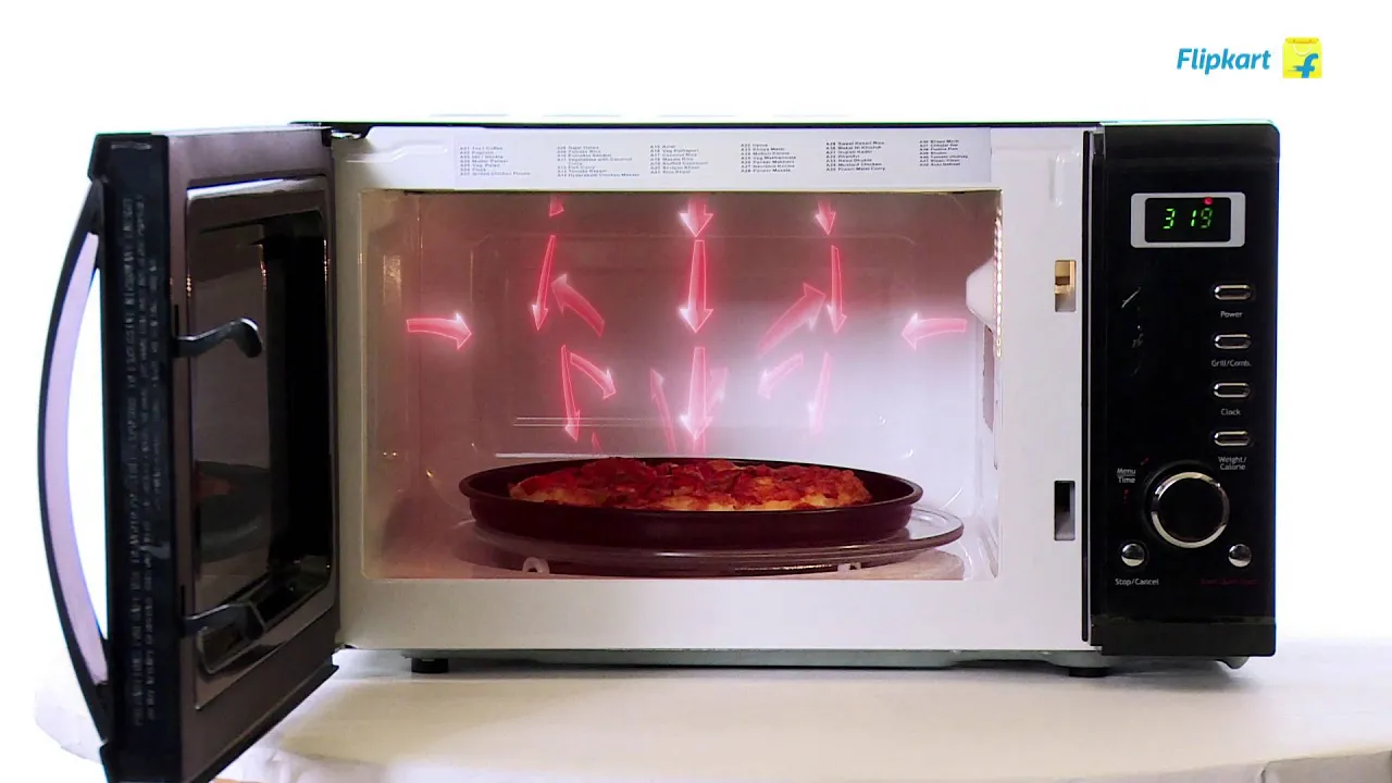 Равномерность нагрева часто обеспечивается специальным крутящимся подносом, на который устанавливается посуда. Поглощая энергию микроволн, молекулы воды в продуктах начинают вибрировать, и в результате их трения и столкновения возникает жар, который и готовит еду.