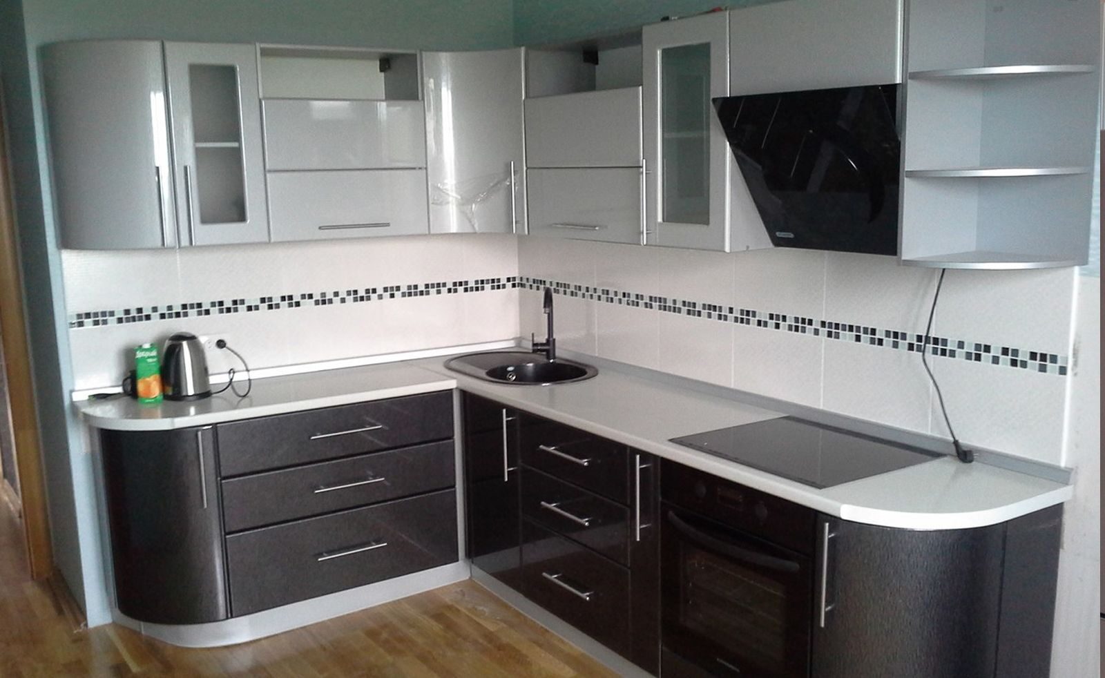 Что касается формы гарнитуры, то она может быть любой — прямой, радиальной, Г- или П-образной. МДФ принимает любую форму, поэтому здесь ориентируйтесь на свои предпочтения. Однако учтите, что прямая гарнитура — самый доступный вариант, тогда как стоимость радиальной гарнитуры из МДФ может достигать ста тысяч рублей.