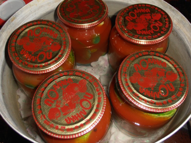 Крышки и банки следует хорошо вымыть. Крышки укладываются в емкость, после чего кипятят. Когда жидкость закипит, сверху следует поставить стальной дуршлаг или сито. На него устанавливаются емкости вниз горлышком. Банки должны кипятиться таким образом на протяжении 7 минут, если вы используете тару объемом 700 мл. Для двухлитровых банок время увеличивается до 15 минут. 3-литровые емкости должны кипятиться не менее 20 минут.