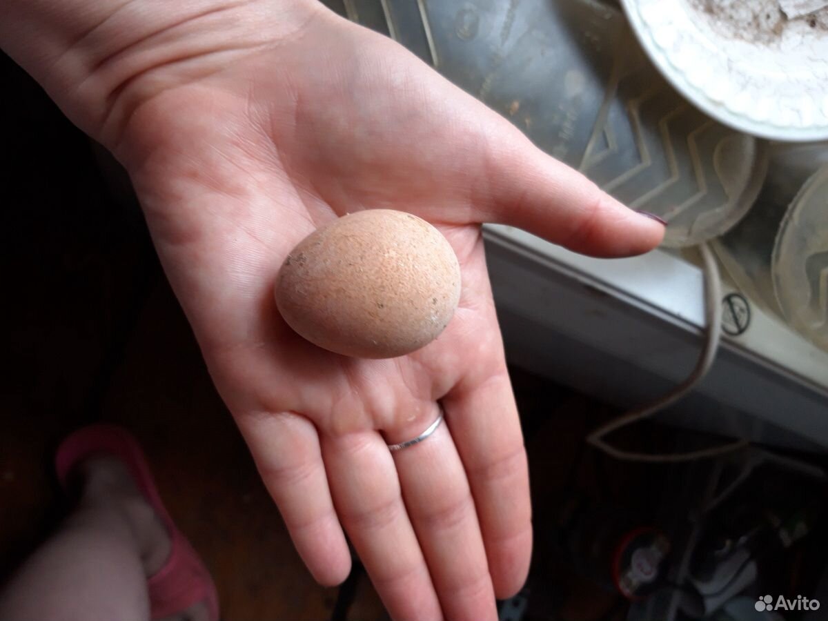 Яйца цесарок обычно кремовые со светло-коричневыми пятнами. Маленький конец яйца более заострен, чем яйцо курицы или утки.