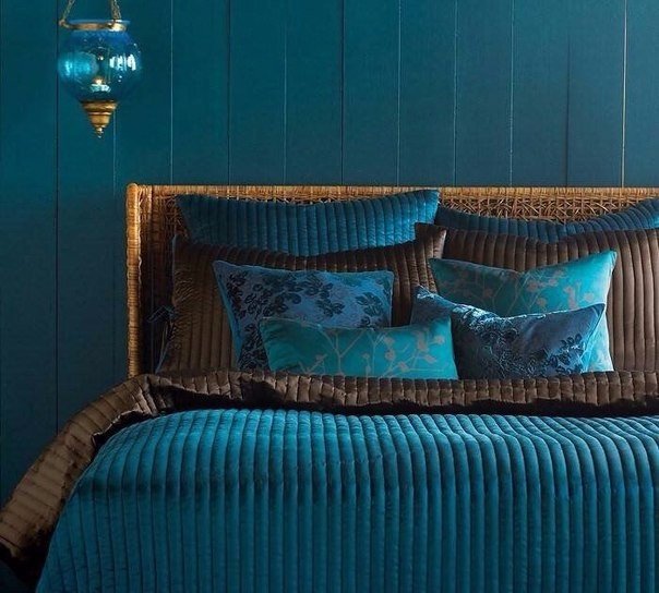 советы, фото Обои цвета морской волны в интерьере спальни