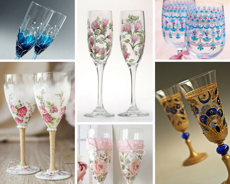 В настоящее время украсить бокалы в ручную можно различными способами. В этом помогут такие техники, как роспись или аппликация. Но чаще всего невесты (а в некоторых случаях и женихи) выбирают такой метод, как декупаж.