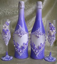 Очень дорого и изысканно смотрятся свадебные бокалы, украшенные бусинами, стразами и жемчужинами. Такой метод декупажа требует больших усилий и времени, поскольку необходимо равномерно зафиксировать жемчужины на стеклянной поверхности. При желании можно с их помощью создать настоящие рисунки. Такие украшения будут обеспечивать дополнительный блеск, и любой напиток в таких сосудах будет смотреться роскошно.