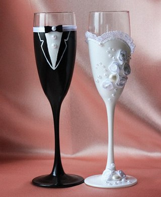 Например, бокал для неё можно оформить при помощи мини-фаты, а для него – смокинга.