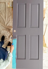 Лучше всего снять дверь и покрасить ее снаружи, но если вы красите дверь, когда она висит на петлях, убедитесь, что вы замаскировали фурнитуру и дверную коробку, чтобы предотвратить брызги. Не забудьте положить на пол два или три слоя газет, чтобы не пропустить капли.