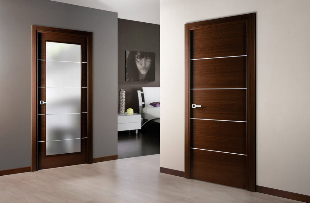 - Хорошим решением для оформления современного интерьера станет деревянная дверь с небольшими стеклянными горизонтальными вставками. Межкомнатные двери в темном цвете отлично сочетаются с темно-бежевой отделкой и светлым ламинатом;