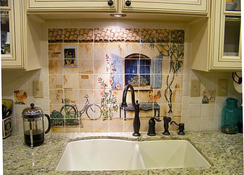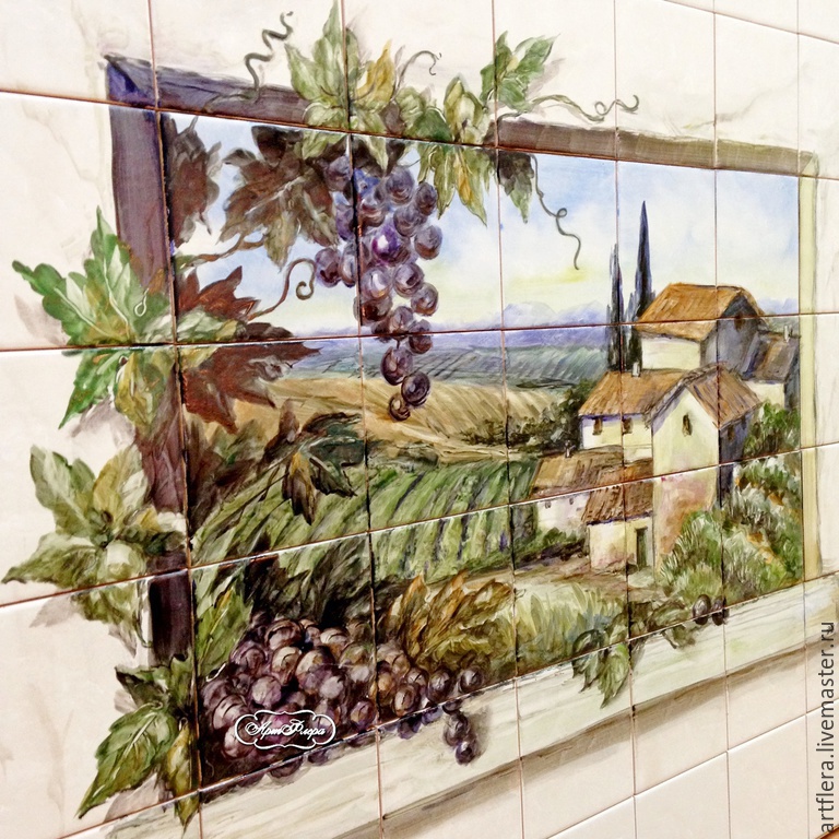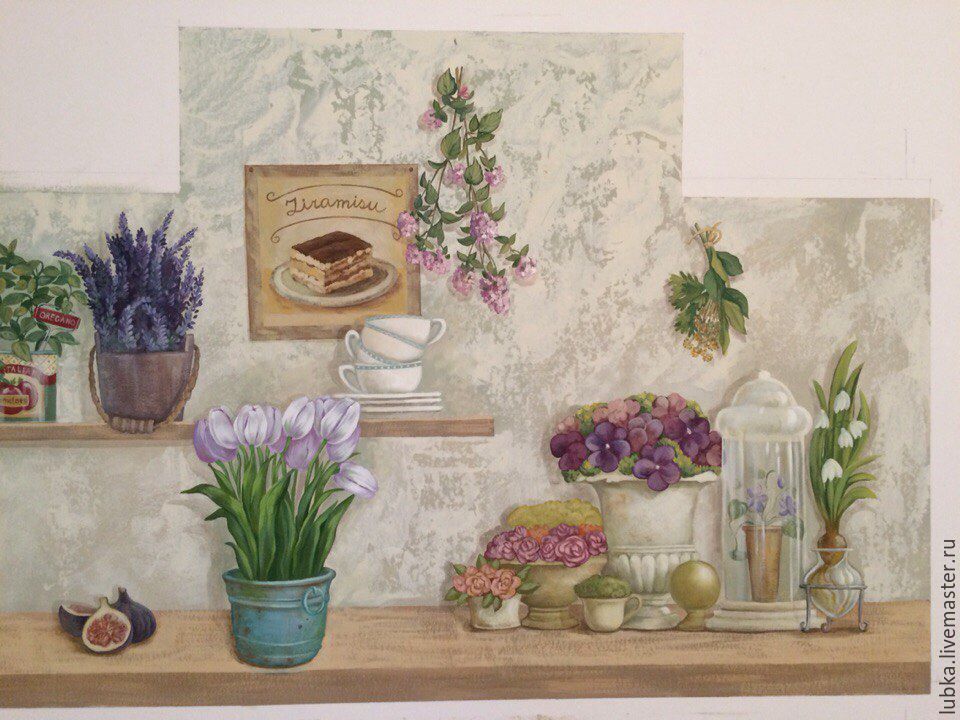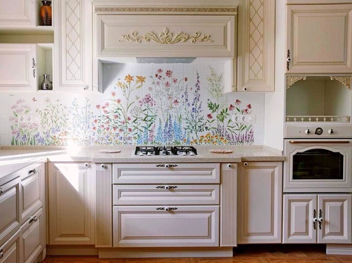 Но эту поверхность можно не просто покрасить: сюда можно нанести роспись. Довольно часто фартук оформляют в виде фрески, имитируя слегка облупившийся старинный рисунок. Интригующе выглядит отделка стен рабочей зоны, да и остальной кухни, если роспись будто спрятана за новыми материалами, которые со временем откололись.