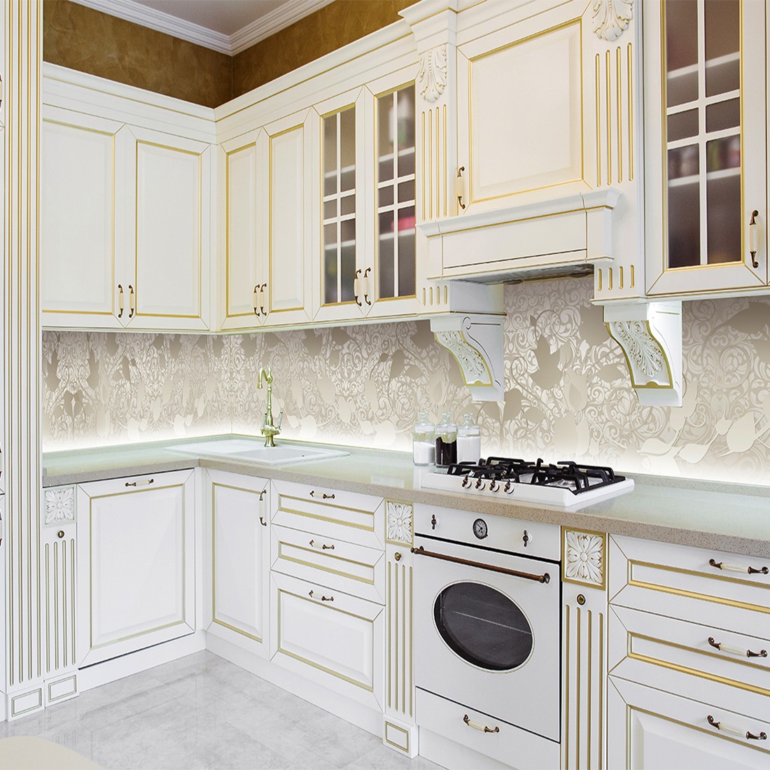 При оформлении кухни, вы можете выбрать однотонный фартук или декорированный изысканными узорами в «французской» стилистике. Его могут украшать абстракции или изысканные цветочные и растительные принты.