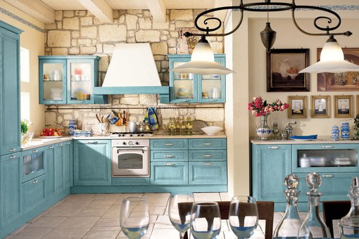 На кухне вы должны иметь дело не только с цветом стен и пола, но и с мебелью и аксессуарами. Мебельные шкафы должны быть яркими. Здесь идеально подойдут серванты в стиле ретро с интересными резными фасадами. Мебель можно специально состарить, что придаст ей еще больше шарма. Стоит сделать ставку на мотивы, которые связаны с Провансом.Оливковые веточки или цветы лаванды — отличный выбор. Что касается дополнений, то здесь нет никаких ограничений. Кухня в стиле прованс любит художественный беспорядок. Стоит запастись рамками, декоративными вазами, льняными скатертями или плетеными корзинами. Также отлично подойдут горшочки с травами, чесночные косы или лейки и начинки из полевых цветов. Именно дополнения помогут создать настоящую кухню в стиле прованс с душой.