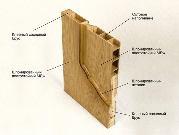 Двери с такой конструкцией очень прочные и устойчивые, не деформируются от влажности и перепада температур.