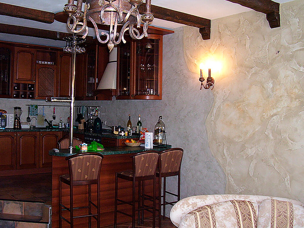 Жидкие обои легко подобрать под интерьер кухни, оформленной в любом стиле. Вы сможете декорировать стены в одном тоне или же создать дизайн с рисунком.