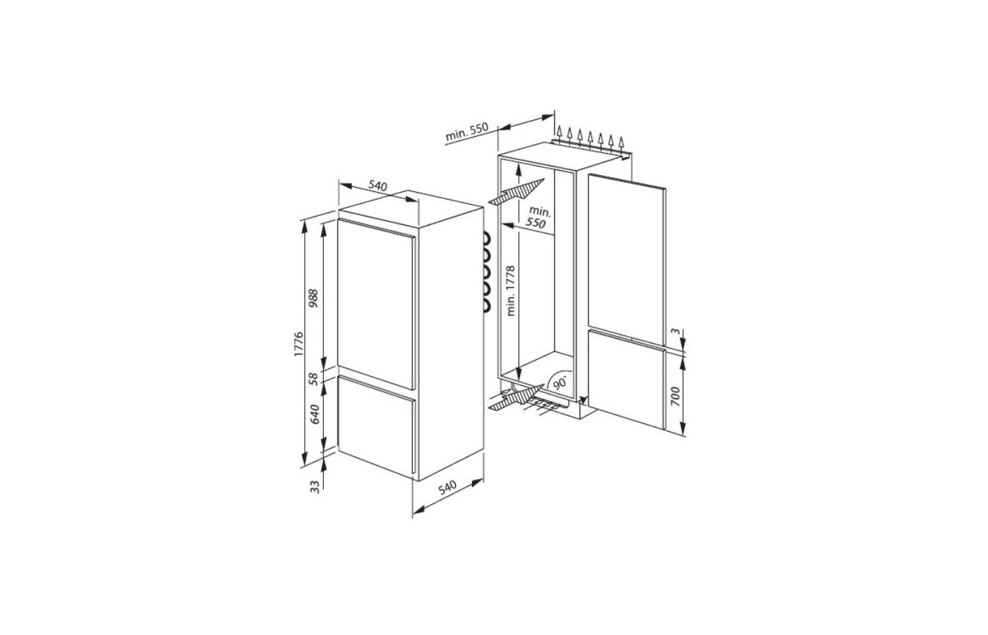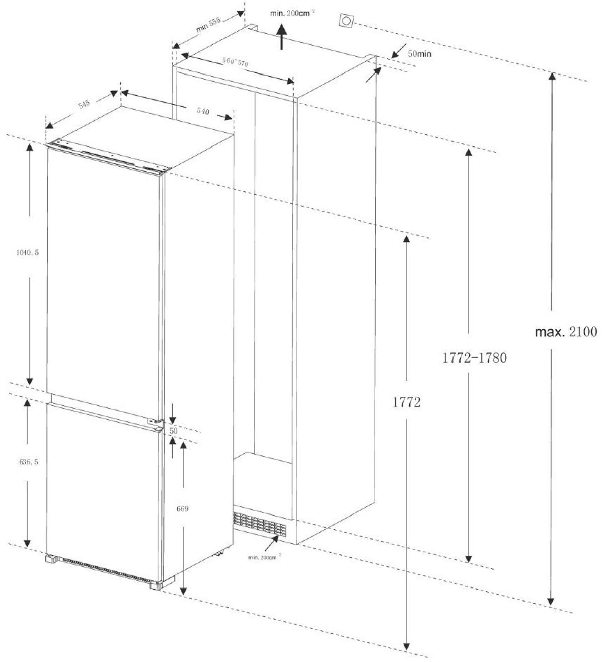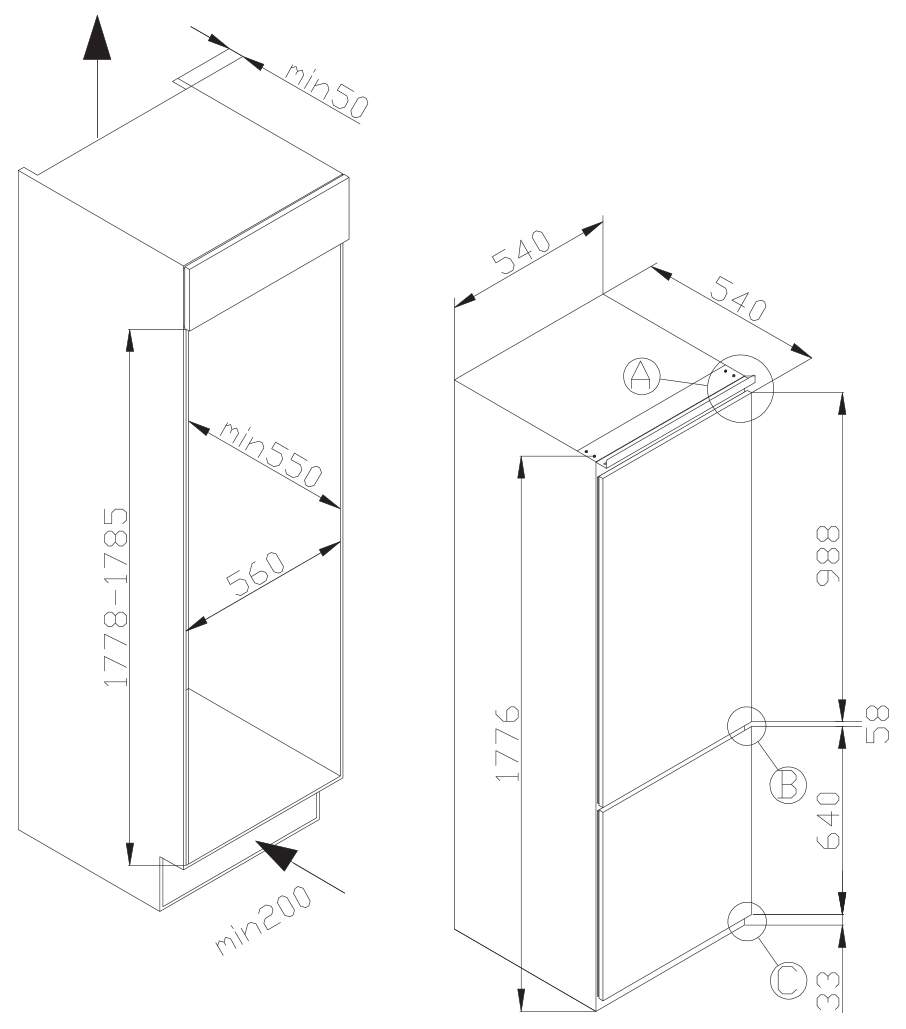 - При установке габаритных двухкамерных встроенных холодильников должен быть установлен отдельный вентилятор для отвода нагретого воздуха от корпуса шкафа.