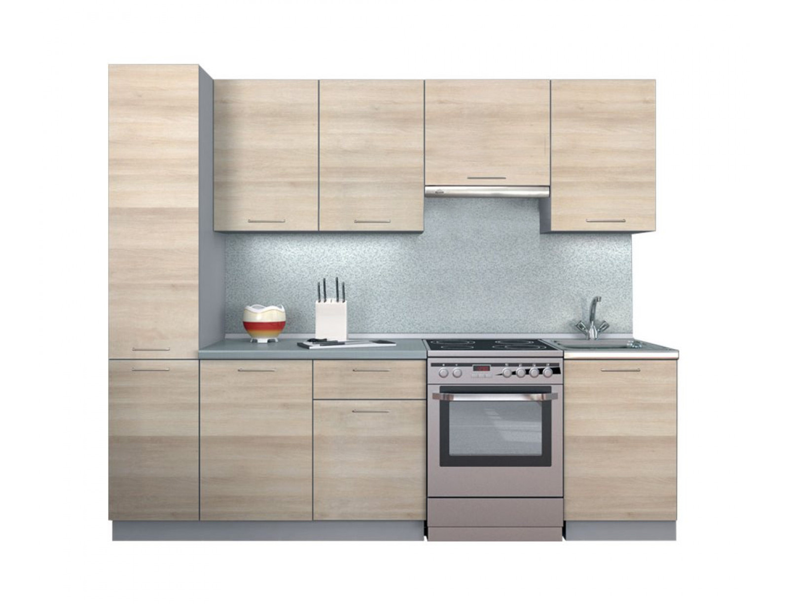 Если говорить обобщенно, кухонный гарнитур состоит из каркаса (короба), лицевых сторон ящиков и шкафов (фасадов) и рабочих поверхностей — столешниц.