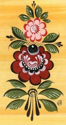 Цветочная роспись чаще всего используется, так как она наиболее проста в исполнении.В менее сложном варианте можно изобразить за работой одиночный цветок с расходящимися от него листьями. В более сложном варианте, например, на боковых стенках часто изображают полосу растительного орнамента, а крышку украшают вписанными в круг цветами. На крышках хлебных корзин цветы обычно помещают прямоугольником или ромбом. В растительном орнаменте можно выделить следующие наиболее распространенные виды орнамента: