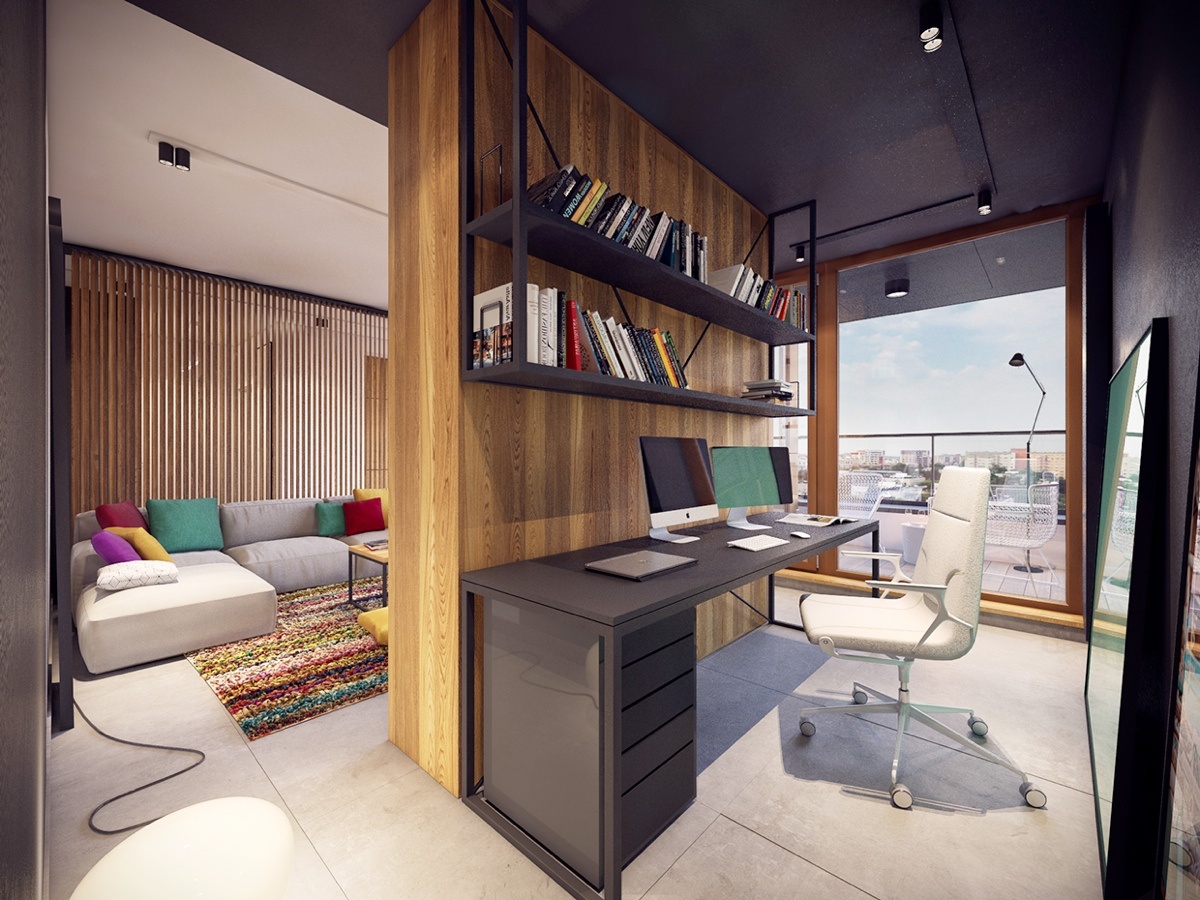 Рабочую зону можно выделить с помощью цвета. Если интерьер гостиной достаточно яркий и броский, зону для работы рекомендуется сделать нейтральных цветов, чтобы обеспечить максимальную сосредоточенность на работе.