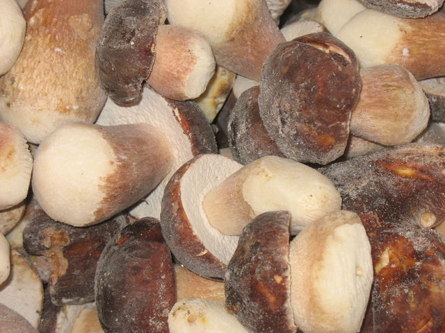 Мороженные белые грибы сохраняют свой вкус, цвет, запах и питательную ценность. Единственным недостатком такого способа заготовки можно назвать то, что после тепловой обработки замороженные грибы теряют большую часть своего объема. Для того чтобы уменьшить объем грибов перед заморозкой, рекомендуется предварительно обжарить или отварить их. Перед заморозкой свежих грибов необходимо тщательно их очистить, обрезать ножки и помыть в холодной проточной воде. После этого рекомендуется обсушить грибы на полотенце, нарезать небольшими ломтиками и разложить небольшими порциями по полиэтиленовым пакетам.
