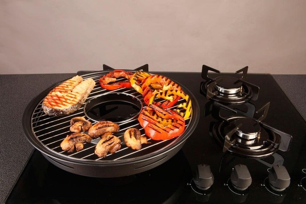 Оригинальная инновационная сковородка «гриль газ» позволяет в обычной кухне на обычной газовой плите пожарить рыбу практически как на мангале. Сковородка имеет в середине отверстие, совпадающее по диаметру с газовой конфоркой.