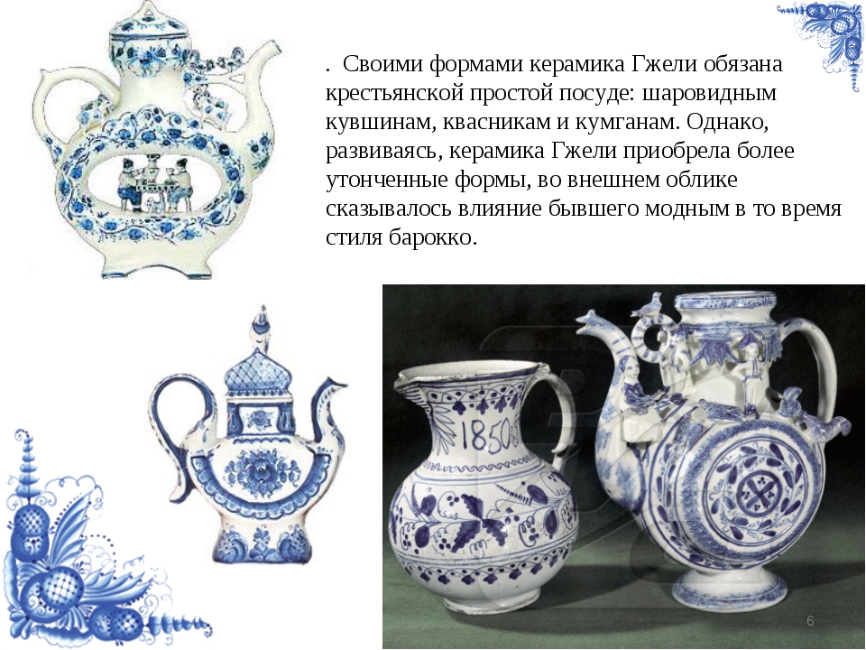 Кувшины, квасники и кумганы местных мастеров активно раскупались. Посуду делали как с изображением пейзажей, так и с изображением людей. Любили гжельские умельцы делать посуду и с юмористическими сюжетами.