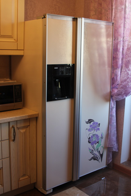 Продается самая разнообразная виниловая пленка на холодильник. Ваш холодильник может стать блестящим или зеркальным. На одной кухне хорошо будет смотреться клеящее покрытие в виде кожи, на другой – в виде дерева, бархата, мрамора и т.д. Можно обклеить однотонной пленкой, а можно и с орнаментом.