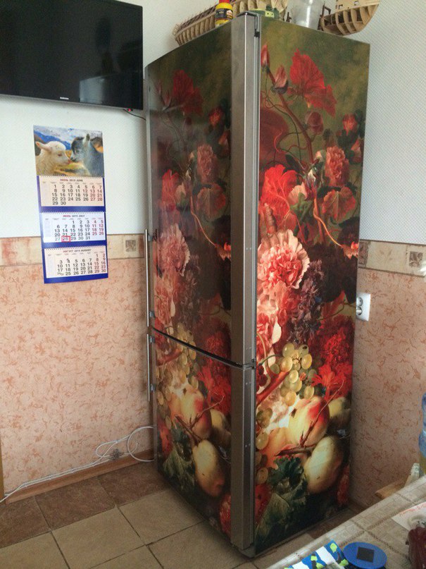 Виниловая пленка поможет сделать холодильник ярким акцентом и стильным добавлением на кухне.