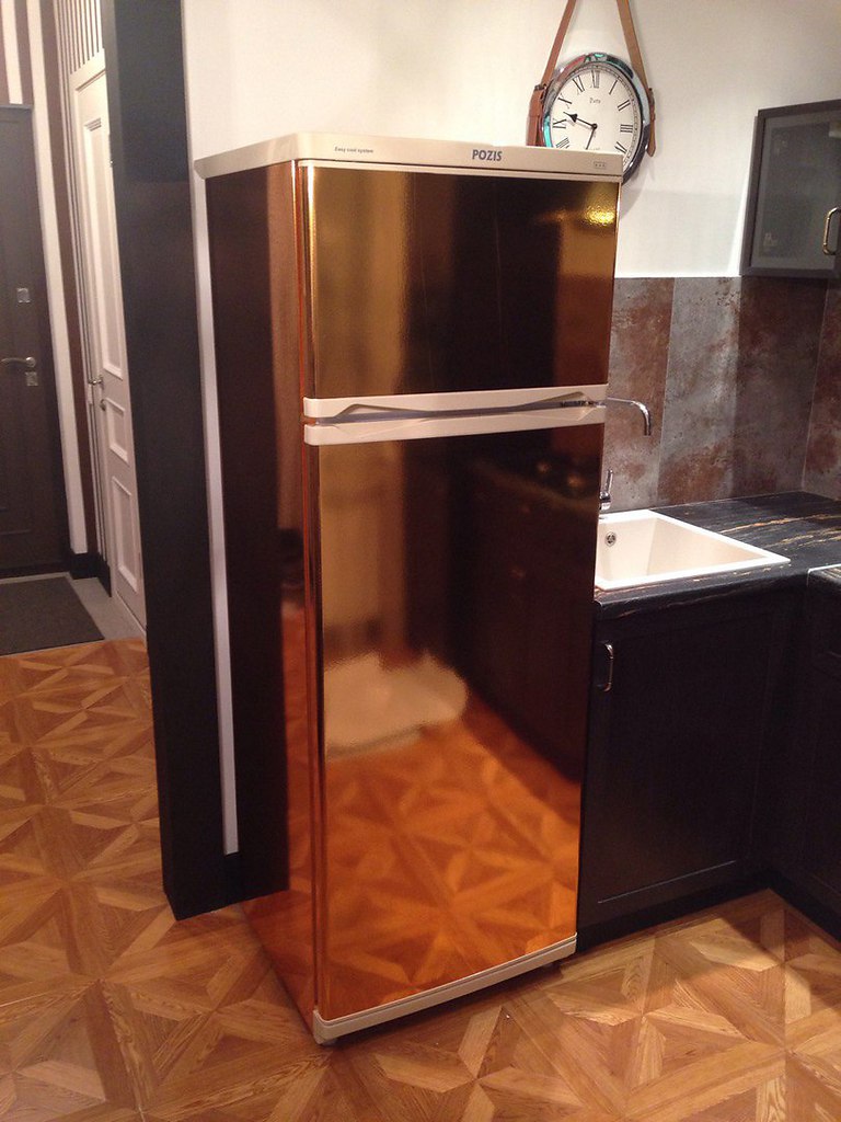 В продаже есть цветные холодильники. Они стоят очень дорого. Можно самостоятельно придать агрегату современный вид и обклеить холодильник пленкой. Постарайтесь, чтобы он вписался в дизайн вашей кухни. Обновить можно старый советский холодильник и агрегат современного образца.